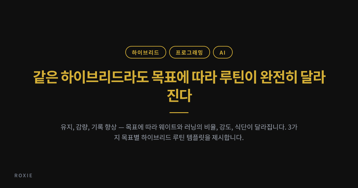 유지, 감량, 기록 향상 — 목표에 따라 웨이트와 러닝의 비율, 강도, 식단이 달라집니다. 3가지 목표별 하이브리드 루틴 템플릿을 제시합니다.